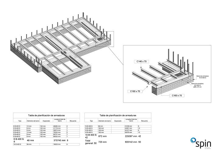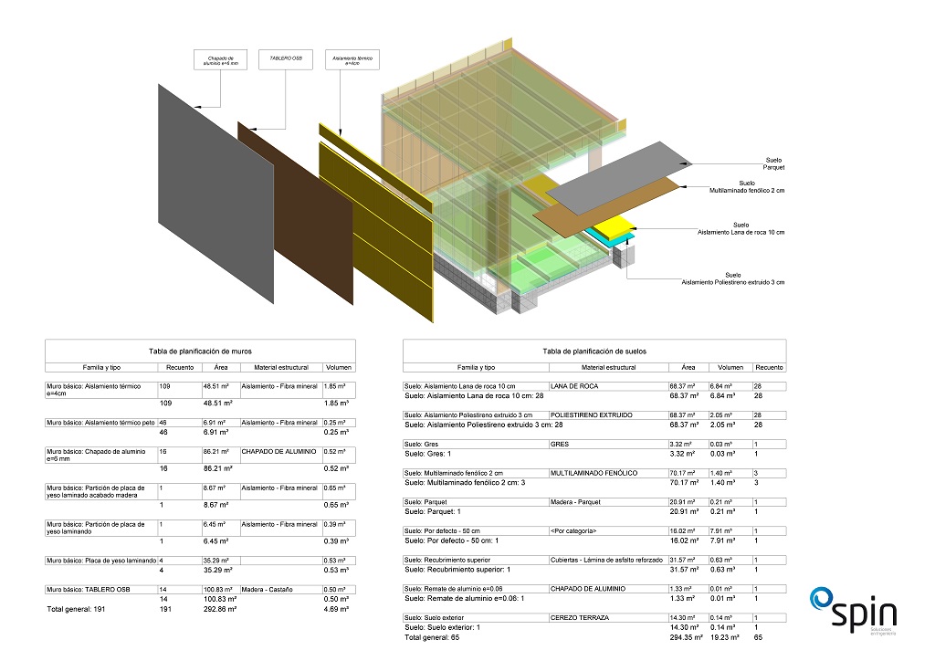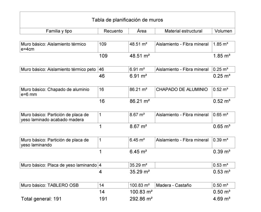 Aplicado a nuestro modelo, podemos obtener la contabilización de las armaduras de cimentación, perfilerías de la estructura, o las tipologías de los muros; por citar algunos ejemplos.