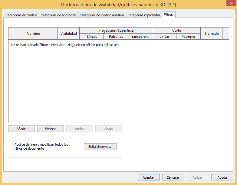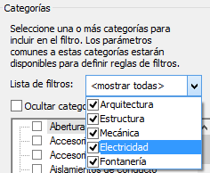 Pulsaremos sobre Añadir y veremos los filtros que existen por defecto en Revit.