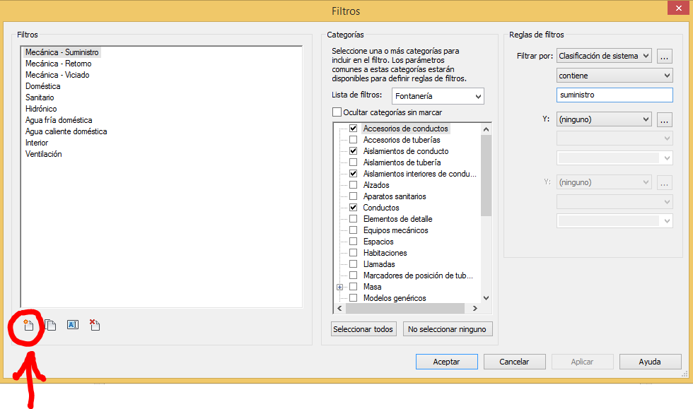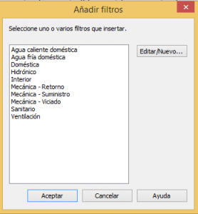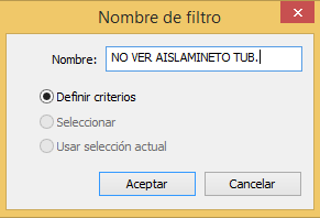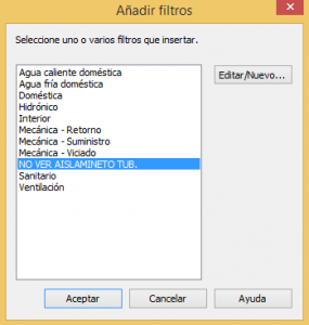 Como en este caso lo que queremos es ocultar el aislamiento de todas las tuberías, lo que haremos será crear nuestro propio filtro, para ello pulsaremos en Editar/Nuevo y se abrirá la siguiente ventana y pulsaremos sobre el icono de crear nuevo.